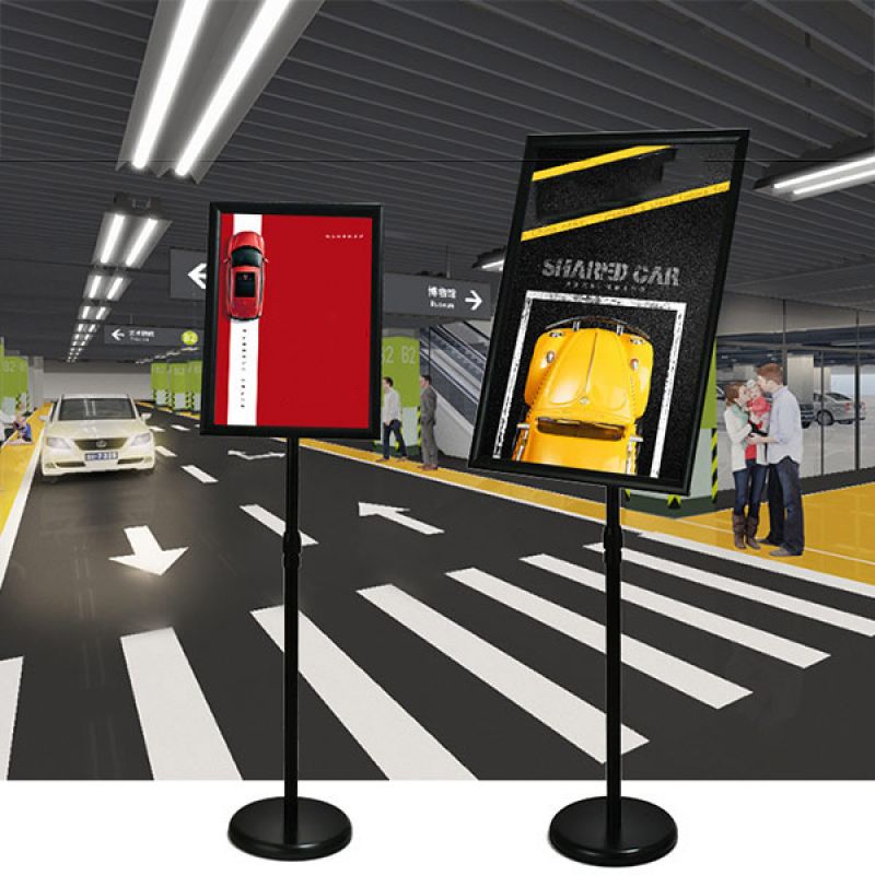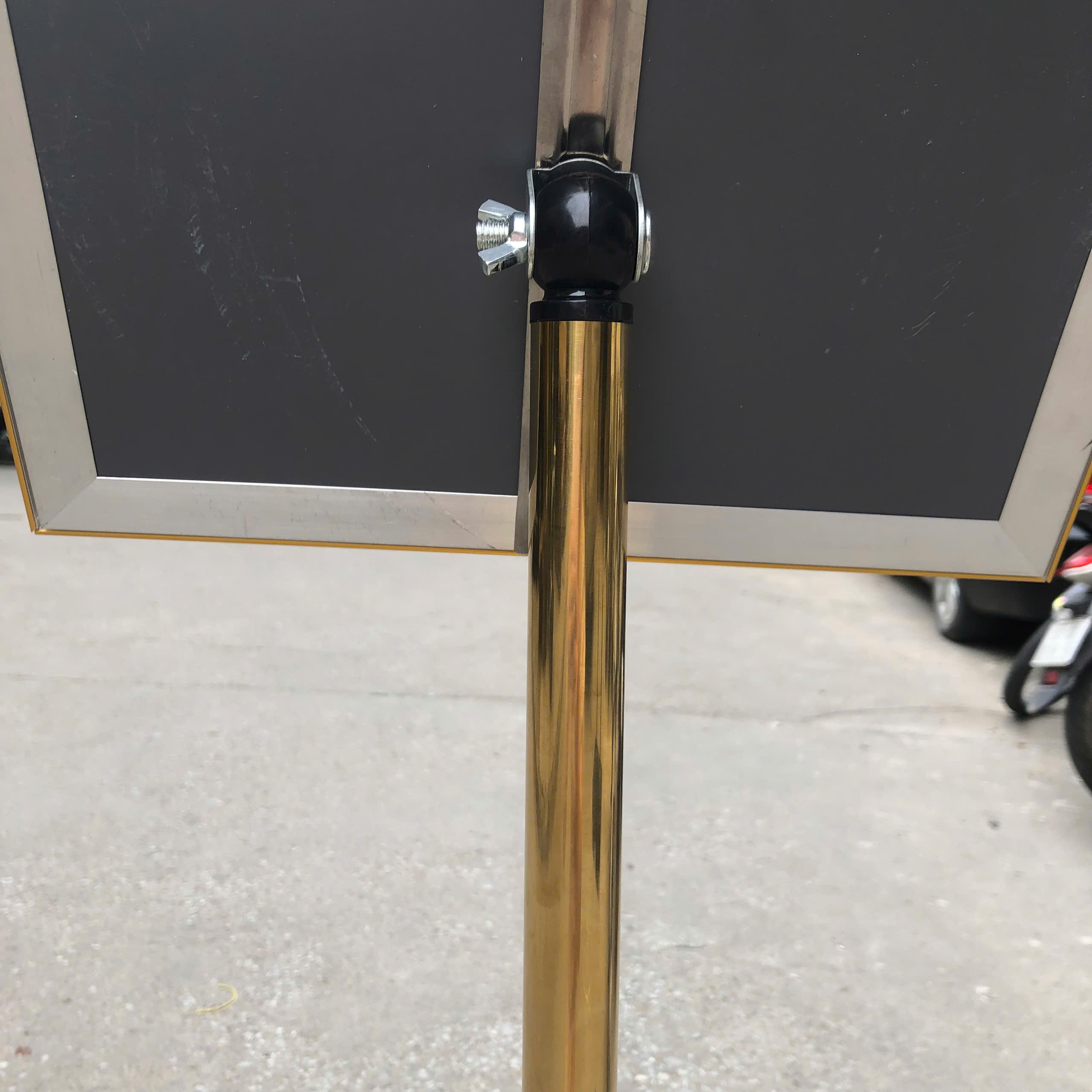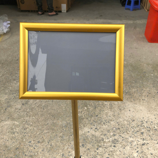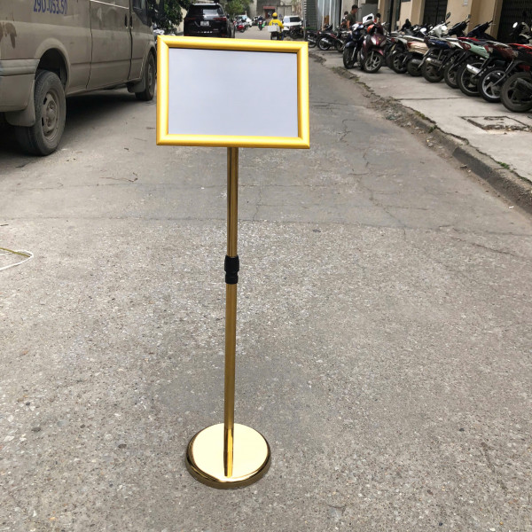 Bảng có kích thước tổng thể 24 x 32.7 x 120 cm, nhỏ gọn nhưng vẫn đủ nổi bật để gây ấn tượng với khách hàng. Phần lòng bảng chuẩn A4 (21 x 29.7 cm) giúp người dùng dễ dàng in ấn, thay thế và cập nhật nội dung, đảm bảo thông tin luôn mới mẻ và rõ ràng.