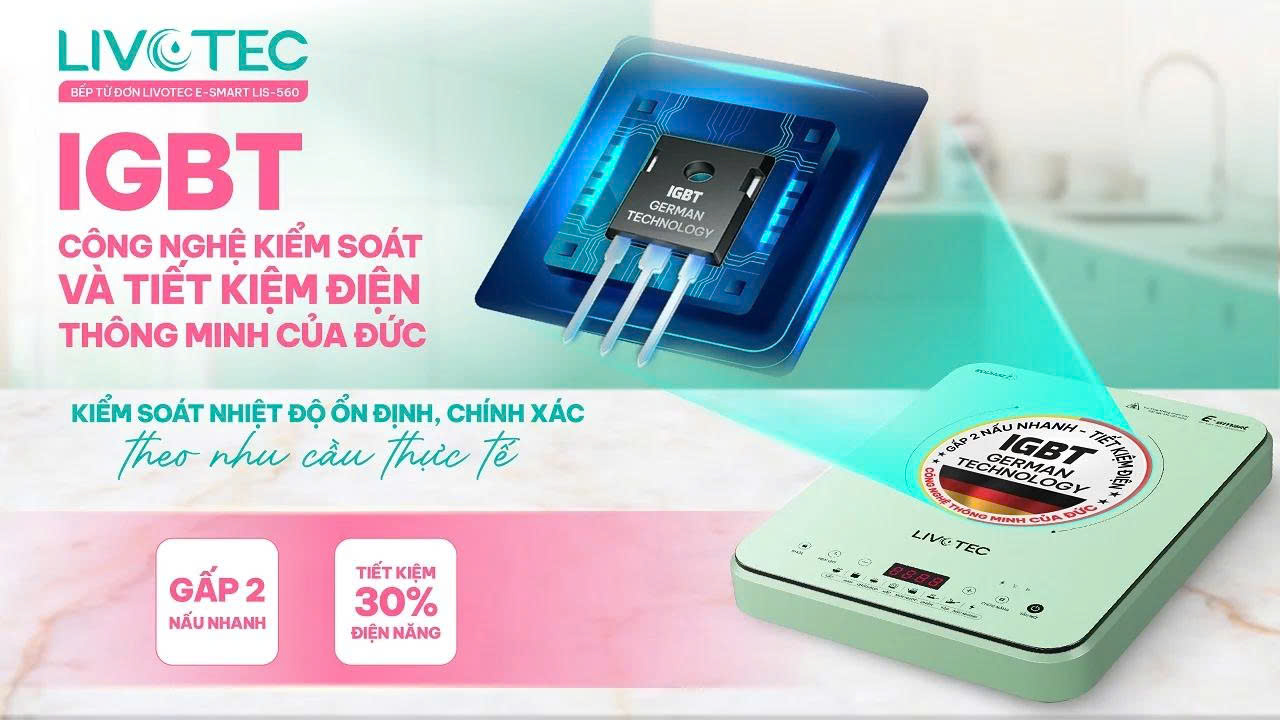 Livotec LIS-560G ứng dụng công nghệ E-Smart giúp gia tăng tốc độ gia nhiệt nhanh hơn gấp 2 lần so với phương pháp nấu truyền thống. Nhiệt lượng tập trung trực tiếp vào đáy nồi, hạn chế thất thoát ra môi trường xung quanh.