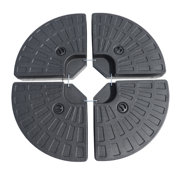 Đế được làm từ HDPE cao cấp, bền bỉ, chịu lực tốt, chống nứt vỡ và thích hợp sử dụng ngoài trời lâu dài. Mỗi miếng đế có dung tích 16L, có thể đổ nước hoặc cát để tăng trọng lượng, giúp ô đứng vững trước gió mạnh. Trọng lượng sau khi đổ nước hoặc cát dao động từ 62–100 kg, đảm bảo an toàn và ổn định tối đa.