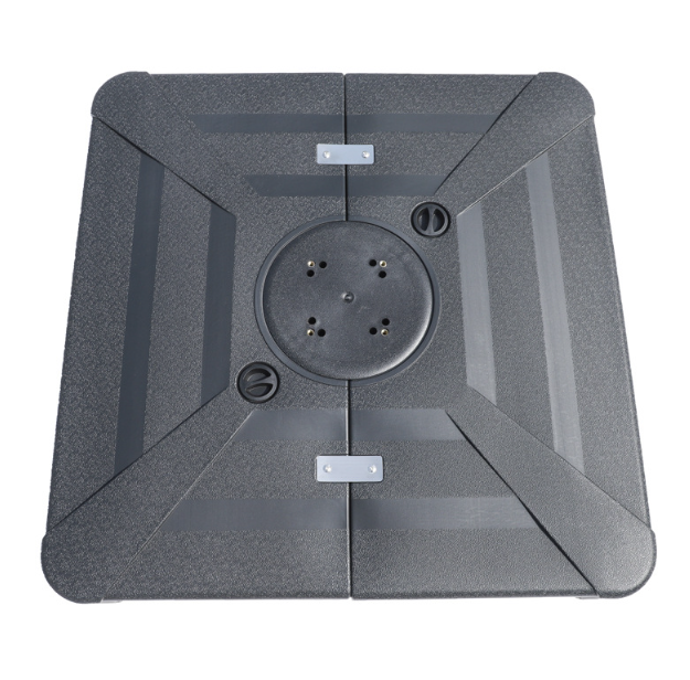 Đế được làm từ HDPE bền bỉ, chịu lực tốt, chống nứt vỡ và thích hợp sử dụng ngoài trời lâu dài. Với dung tích lớn 100L, đế có thể đổ nước hoặc cát để tăng trọng lượng, giúp ô đứng vững trước gió mạnh. Trọng lượng sau khi đổ đầy nước hoặc cát dao động từ 100–160 kg, đảm bảo an toàn và ổn định tuyệt đối cho người dùng.