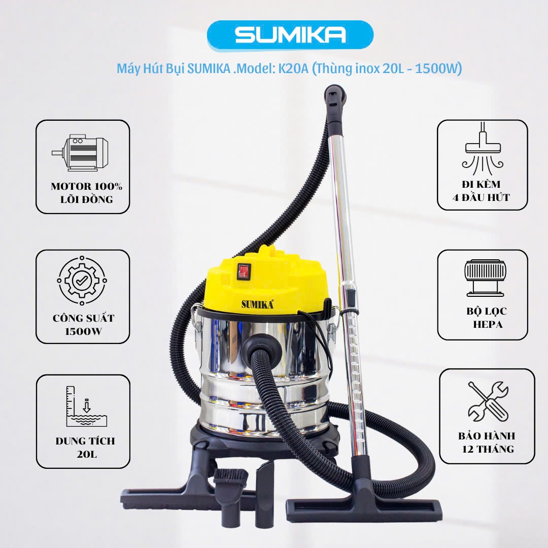 Sumika K20A là thiết bị vệ sinh đa năng tích hợp 3 chức năng hút bụi khô, hút nước và thổi khí, phù hợp cho gia đình, văn phòng và cửa hàng nhỏ. Máy có công suất 1500W mạnh mẽ, dung tích thùng chứa 20 lít giúp làm sạch nhanh chóng nhiều bề mặt khác nhau. Sản phẩm đi kèm đầy đủ phụ kiện như ống hút, đầu hút và túi lọc bụi, hỗ trợ vệ sinh hiệu quả, dễ sử dụng và bảo dưỡng. Với hiệu suất ổn định, độ bền cao và mức giá hợp lý, Sumika K20A là lựa chọn đáng tin cậy cho nhu cầu làm sạch toàn diện.