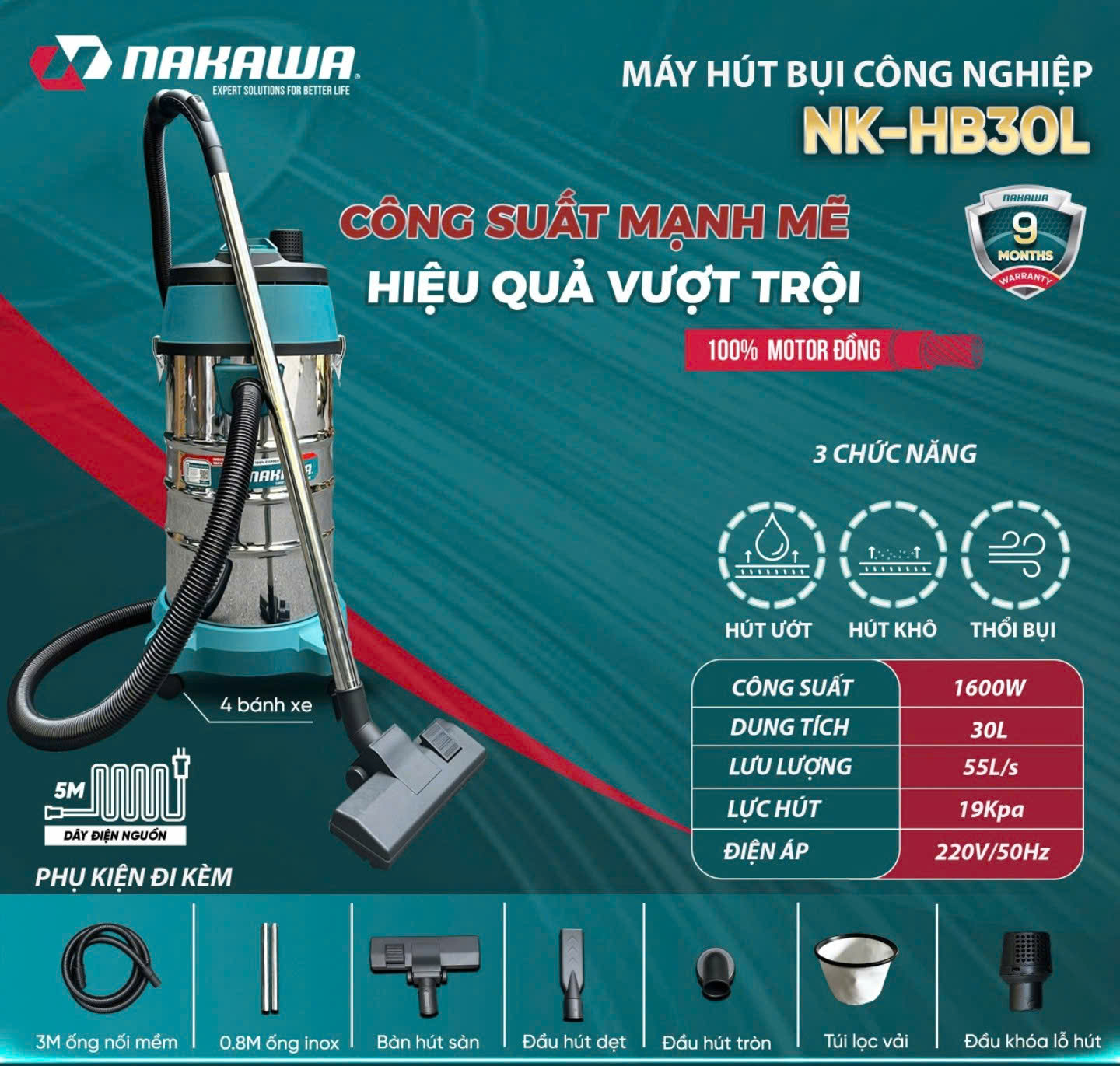 NAKAWA NK-HB30L là lựa chọn đáng tin cậy cho nhà xưởng, văn phòng và khu vực vệ sinh chuyên nghiệp, nhờ công suất 1600W, lưu lượng hút 55 lít/giây và thùng chứa 30L giúp làm sạch nhanh, hiệu quả. Trang bị mô tơ 100% dây đồng, máy vận hành bền bỉ, ổn định, phù hợp nhu cầu sử dụng liên tục, mang lại không gian sạch sẽ và tiết kiệm thời gian vệ sinh.