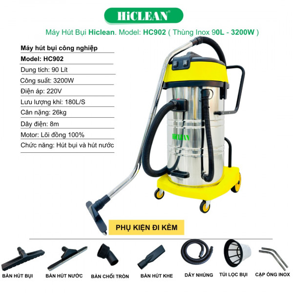 Máy hút bụi công nghiệp HiClean HC 902 là một trong những thiết bị vệ sinh công nghiệp cao cấp, được thiết kế để đáp ứng nhu cầu làm sạch mạnh mẽ trong môi trường làm việc có diện tích lớn và mật độ bụi bẩn cao. Với dung tích thùng chứa lên tới 90L cùng motor nhập khẩu từ Italy, dòng máy này không chỉ cho hiệu suất hút vượt trội mà còn có độ bền ấn tượng trong phân khúc máy hút bụi công nghiệp tầm trung đến cao cấp.