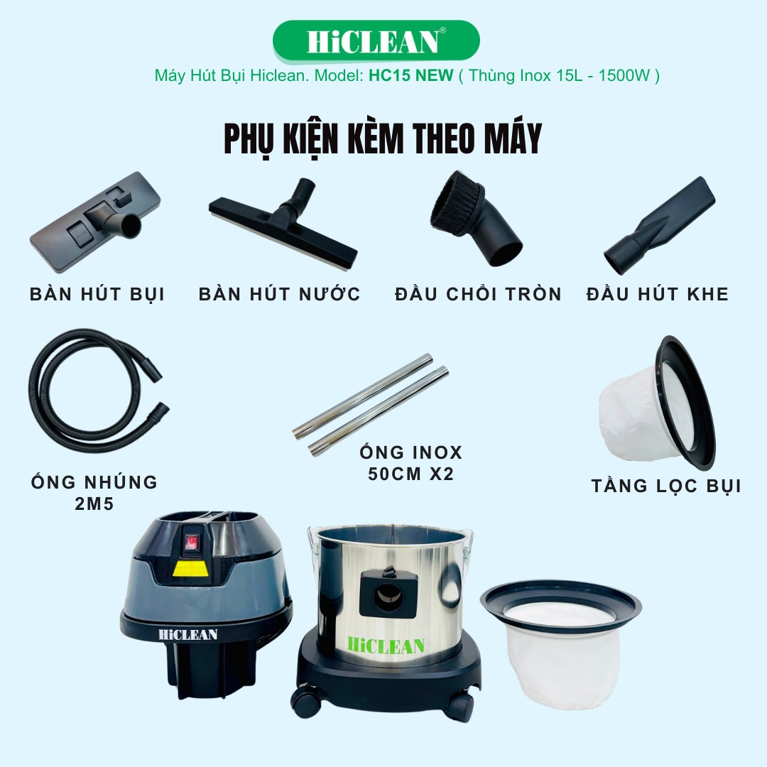 Máy hút bụi HiClean HC15 New được trang bị đầy đủ bộ phụ kiện theo chuẩn dòng máy hút bụi công nghiệp HiClean, bao gồm: bàn hút bụi, bàn hút nước, đầu chổi tròn, đầu hút góc, hút khe rãnh, ống mềm, ống nối dài bằng inox và túi lọc vải. Bộ phụ kiện này cho phép máy linh hoạt trong nhiều tình huống: từ hút bụi mặt sàn, nước tràn, đến làm sạch các góc hẹp, khe rãnh và bề mặt không đồng đều.