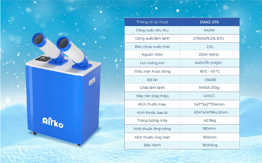 Airko DAKC-27S sở hữu nhiều ưu điểm vượt trội, đáp ứng cả nhu cầu khắt khe nhất: máy có công suất làm lạnh 2700W (9.215 BTU/h) giúp hạ nhiệt nhanh chóng, không cần lắp đặt phức tạp như điều hòa truyền thống. Kích thước nhỏ gọn chỉ 547×342×704 mm, kết hợp bánh xe chắc chắn, cho phép dễ dàng di chuyển giữa các vị trí khác nhau, cực kỳ tiện lợi cho những khu vực thường xuyên thay đổi bố trí sản xuất. Bên cạnh đó, thiết bị tiêu thụ điện năng thấp chỉ 940W – dòng điện 4.4A, giúp tiết kiệm chi phí vận hành và thân thiện môi trường. Máy vận hành êm ái dưới 56dB, không gây ảnh hưởng đến môi trường làm việc. Lớp vỏ kim loại bền bỉ, chống va đập, đảm bảo tuổi thọ lâu dài ngay cả trong điều kiện công nghiệp khắc nghiệt. Đặc biệt, sản phẩm được bảo hành chính hãng 18 tháng từ Dorosin Group – thương hiệu uy tín hàng đầu trong lĩnh vực làm mát công nghiệp.