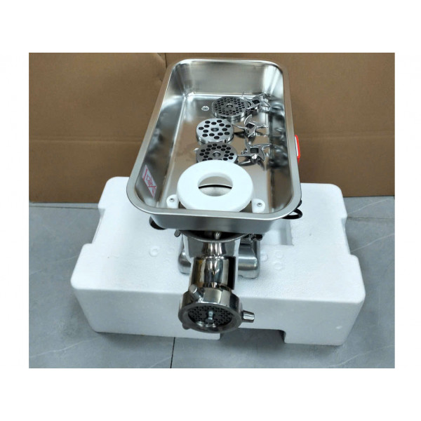 Máy được trang bị các lưới sàng đùn thịt kích thước 6 mm, 8 mm và 12 mm, giúp người dùng dễ dàng điều chỉnh độ thô mịn của thịt theo từng mục đích sử dụng. Đi kèm máy là phụ kiện nhồi thịt và phễu đùn xúc xích, hỗ trợ đa dạng hóa sản phẩm kinh doanh.