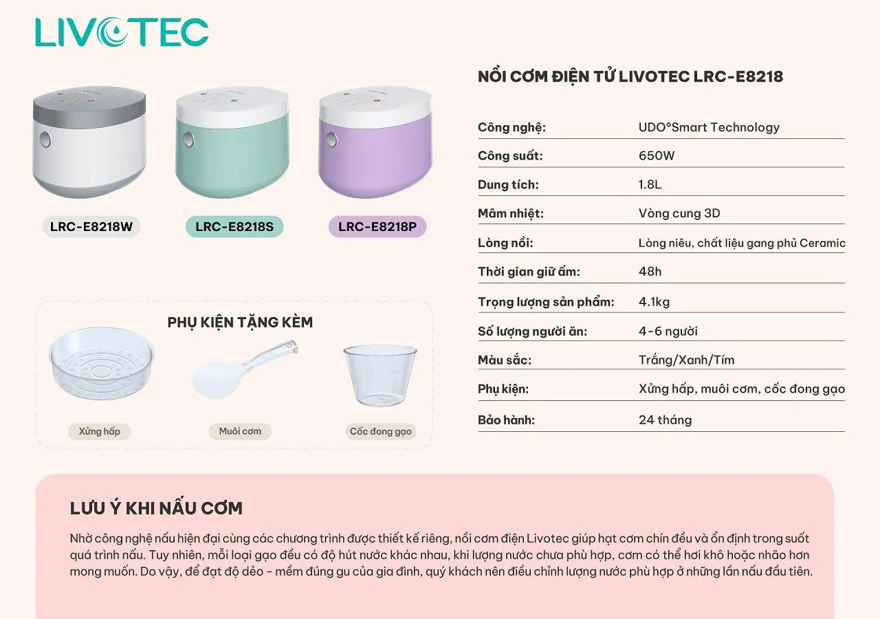 Nếu bạn đang tìm kiếm một chiếc nồi cơm điện tử có khả năng nấu cơm ngon như niêu truyền thống nhưng vẫn tích hợp công nghệ hiện đại, thì nồi cơm điện tử Livotec LRC-E8218P là lựa chọn rất đáng cân nhắc. Sản phẩm hội tụ đầy đủ yếu tố: thông minh, tiện lợi, bền bỉ và giữ trọn hương vị cơm Việt.