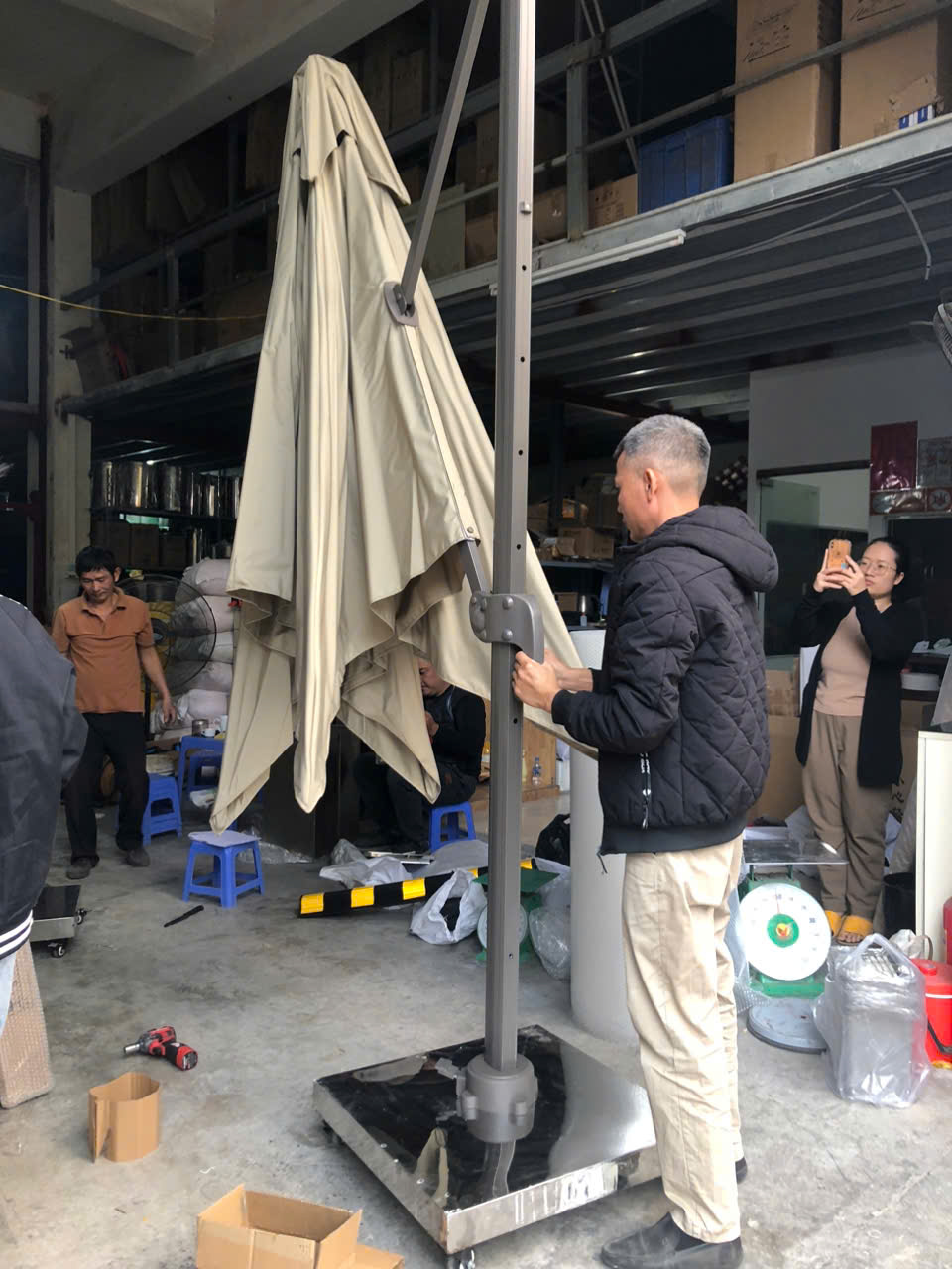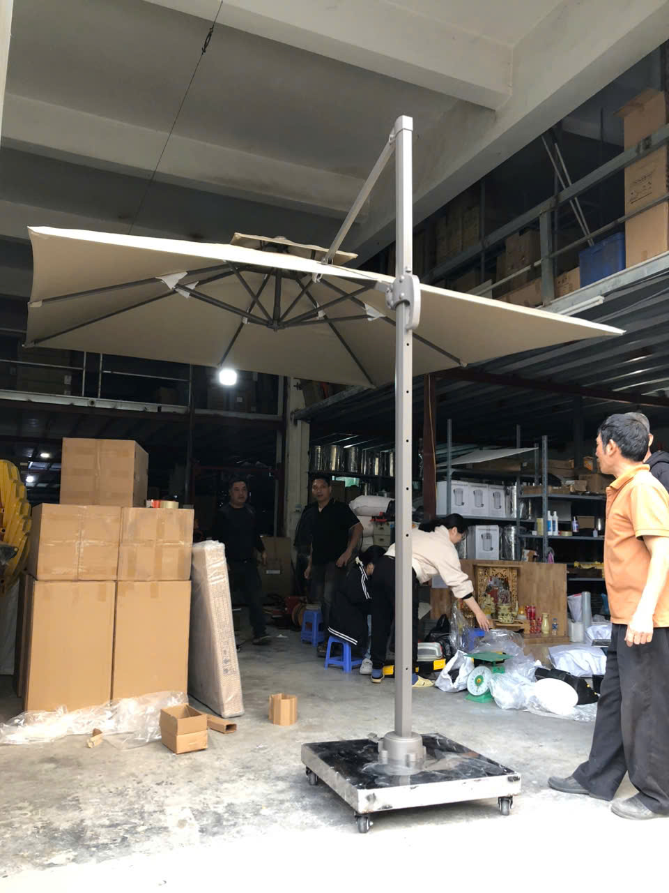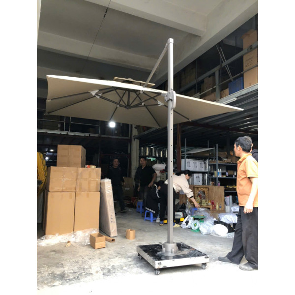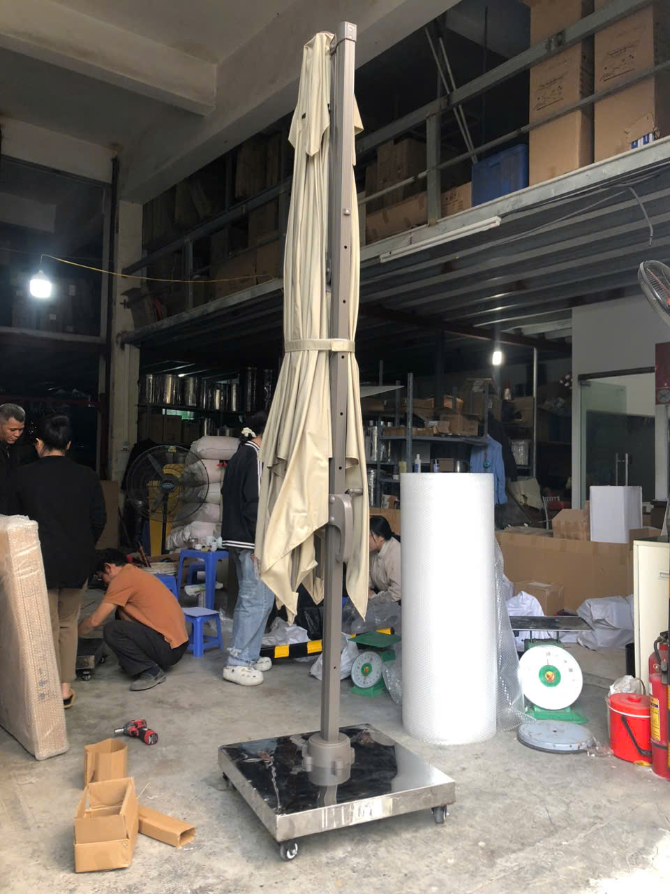 Phần đế ô được làm bằng thép sơn tĩnh điện đổ bê tông, có trọng lượng 90kg, giúp ô đứng vững và an toàn trong mọi điều kiện thời tiết. Đặc biệt, đế được trang bị 4 bánh xe linh hoạt, giúp di chuyển dễ dàng mà không cần tốn nhiều sức. Khi cần cố định, bánh xe có khóa an toàn giúp ô luôn đứng chắc chắn và ổn định.