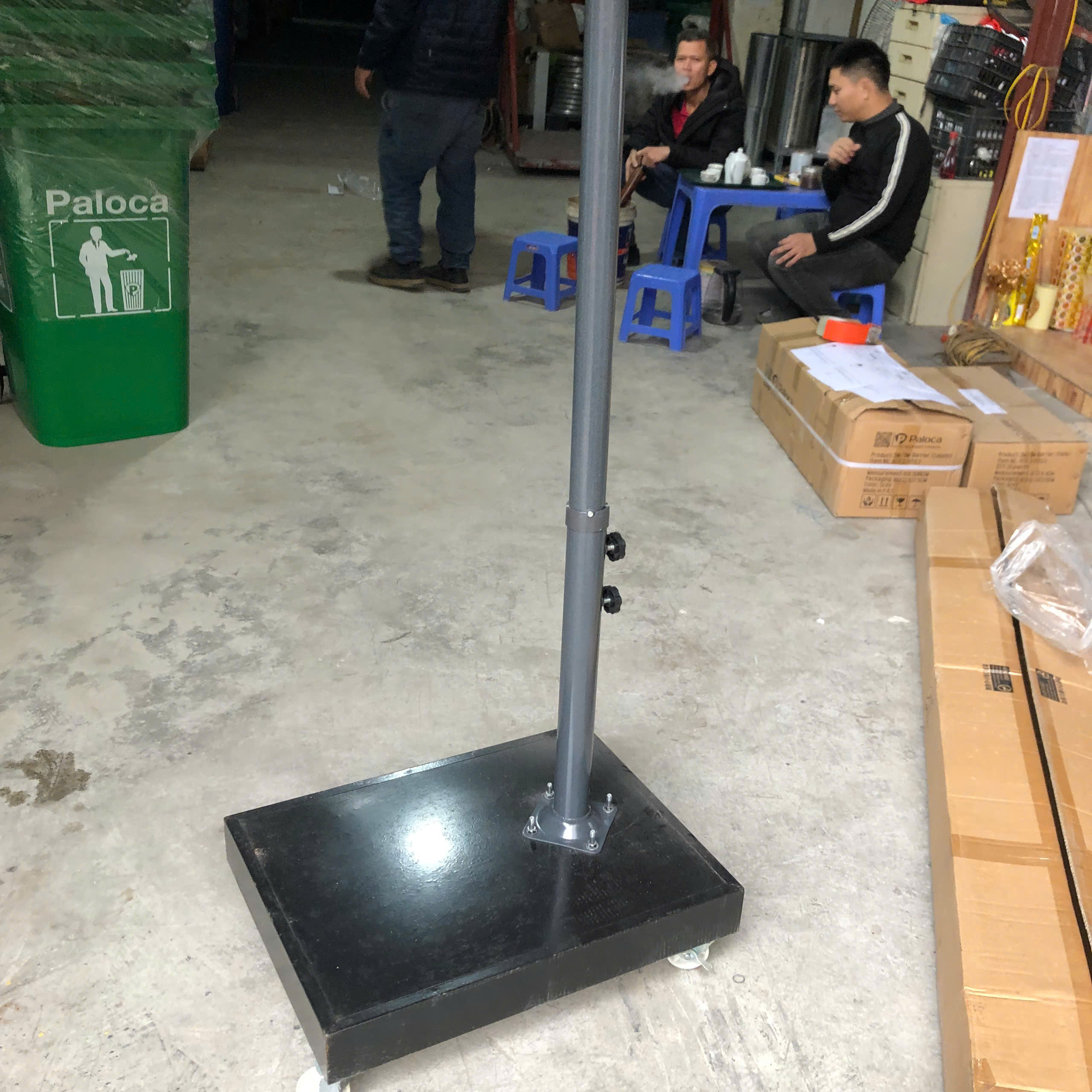 Chi tiết đế | Đế ô bằng thép sơn tĩnh điện đổ bê tông, có 4 bánh xe |