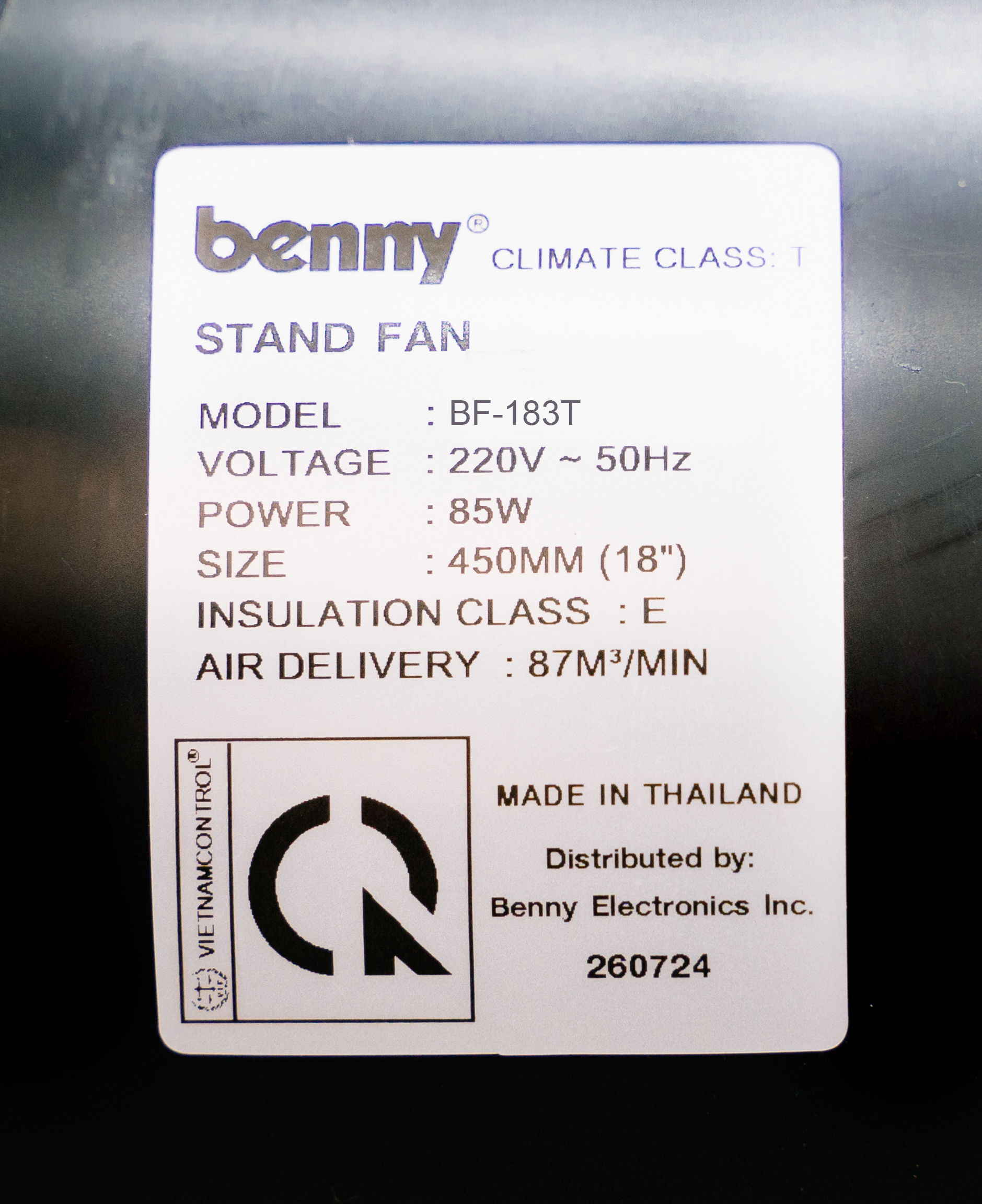 Benny BF-183 đạt tiêu chuẩn năng lượng 5 sao, cho thấy khả năng tối ưu hiệu suất sử dụng điện. Mặc dù tạo ra luồng gió mạnh mẽ, quạt vẫn được thiết kế để giảm thiểu tiêu thụ điện năng.