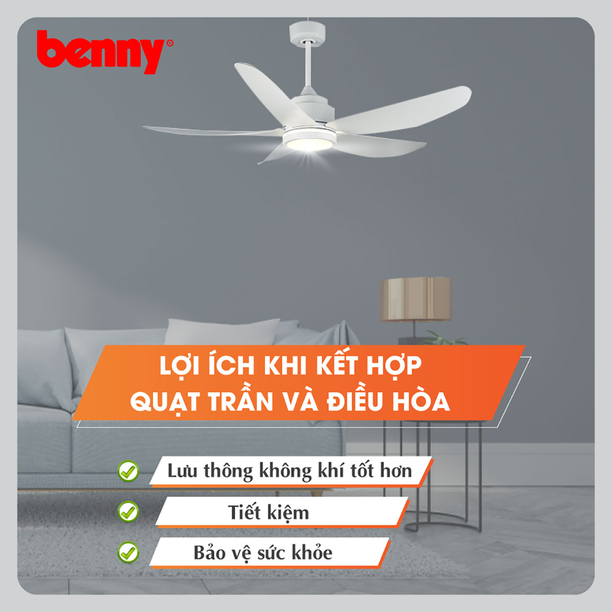 Nhờ khả năng làm mát hiệu quả, quạt trần có thể sử dụng độc lập hoặc kết hợp với điều hòa để tăng khả năng lưu thông không khí, đồng thời tiết kiệm điện năng đáng kể.