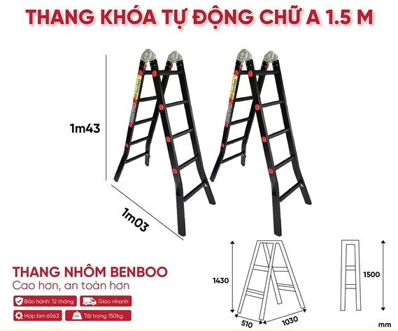 Với thiết kế chữ A khóa tự động an toàn, chiều cao 1,5m phù hợp cho sinh hoạt hằng ngày, chất liệu hợp kim nhôm 6063 bền nhẹ cùng tải trọng ổn định, thang nhôm Benboo chữ A khóa tự động 1,5m là lựa chọn đáng tin cậy cho mọi gia đình.