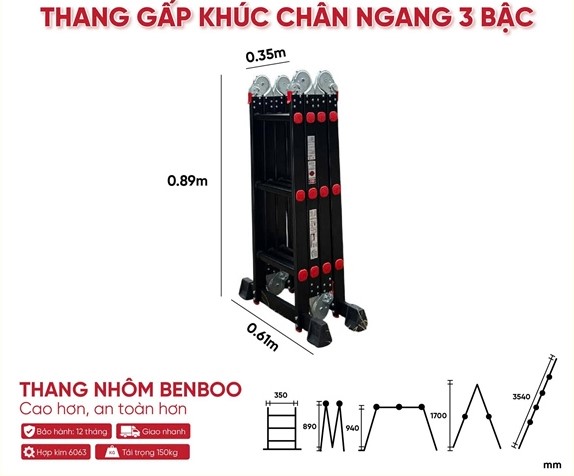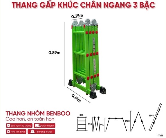 Thang nhôm gấp khúc đa năng chân ngang Benboo 4 đoạn 3 bậc là dòng thang cải tiến được thiết kế nhằm nâng cao độ ổn định và an toàn trong quá trình làm việc ở độ cao. Với cấu trúc gấp khúc 4 đoạn linh hoạt kết hợp hệ chân ngang mở rộng, sản phẩm đặc biệt phù hợp cho các công việc yêu cầu độ vững chắc cao như lắp đặt kỹ thuật, sửa chữa và thi công trong nhiều môi trường khác nhau.