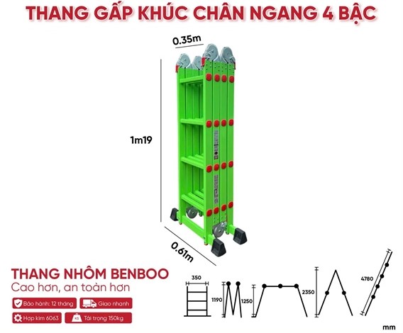 Với thiết kế gấp khúc đa năng 4 đoạn kết hợp chân ngang, chiều cao sử dụng linh hoạt, chất liệu nhôm hợp kim dày 1,5 mm, khả năng gấp gọn tiện lợi và tải trọng 150 kg, thang nhôm gấp khúc đa năng chân ngang Benboo 4 đoạn 4 bậc là lựa chọn lý tưởng cho các công việc trên cao cần sự chắc chắn và an toàn.