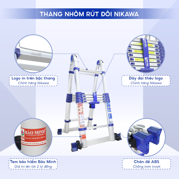 Thang nhôm rút đôi Nikawa NK-50AI-Pri nổi bật nhờ thiết kế 2 trong 1 tiện lợi, chiều cao tối đa 5,07m, cấu tạo chắc chắn và khả năng rút gọn gọn nhẹ. Sản phẩm mang lại sự an toàn, linh hoạt và hiệu quả cho mọi công việc trên cao.