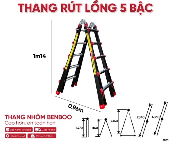 Với thiết kế rút lồng thông minh, sử dụng linh hoạt chữ A và chữ I, chiều cao làm việc lớn, chất liệu hợp kim nhôm 6063 bền nhẹ cùng khả năng gấp gọn tiện lợi, thang nhôm rút lồng Benboo Slide 5 bậc là lựa chọn lý tưởng cho các công việc trên cao trong gia đình và môi trường dân dụng.