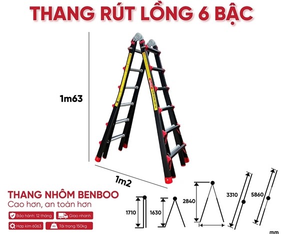Với thiết kế rút lồng thông minh, sử dụng linh hoạt chữ A và chữ I, chiều cao làm việc lên tới 5,86 m, chất liệu hợp kim nhôm 6063 bền nhẹ cùng khả năng gấp gọn tiện lợi, thang nhôm rút lồng Benboo Slide 6 bậc là giải pháp tối ưu cho các công việc trên cao đòi hỏi độ an toàn và hiệu quả cao.