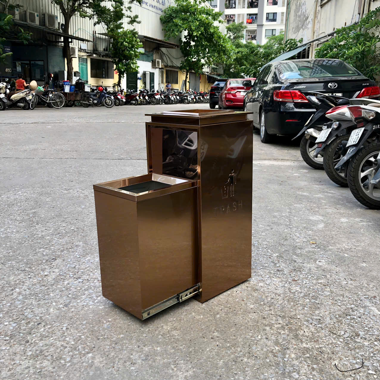 Với kích thước 33 × 33 × 77 cm, thùng rác được thiết kế cân đối, không chiếm nhiều diện tích nhưng vẫn đảm bảo dung tích chứa rác tối ưu. Sản phẩm dễ dàng bố trí tại sảnh lễ tân, hành lang, khu vực chờ hay cửa ra vào mà không ảnh hưởng đến bố cục tổng thể của không gian.