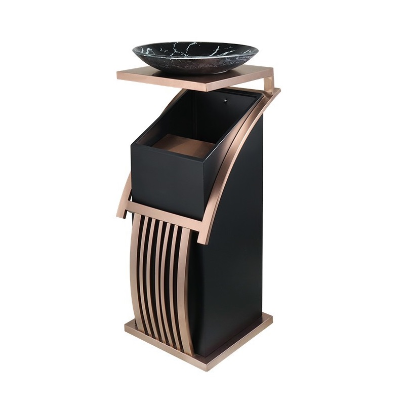 Thùng rác sảnh đồng có gạt tàn HTIZA03 là sản phẩm cao cấp, thiết kế dành cho khách sạn, nhà hàng, trung tâm hội nghị, văn phòng cao cấp hoặc các khu vực sảnh sang trọng. Sự kết hợp giữa inox mạ vàng đồng bóng loáng và thủy tinh đen sang trọng mang đến vẻ đẹp tinh tế, đẳng cấp, đồng thời giữ cho không gian luôn sạch sẽ và hiện đại.