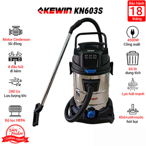 Kewin KN603S có dung tích 60L, công suất mạnh mẽ 3600W – 4500W, hoạt động với điện áp 220V, dây điện dài 8m tiện lợi. Thiết kế hiện đại với công nghệ Mỹ, kiểu hút lốc xoáy + chân không, hỗ trợ hút khô, ướt, nước và thổi đa năng. Trang bị 2 tầng lọc (túi lọc vải + màng HEPA), độ ồn thấp <64dB, bảo hành 18 tháng, phù hợp cho khách sạn, văn phòng, nhà xưởng, bệnh viện và trung tâm thương mại.