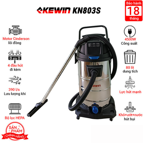 Kewin KN803S sở hữu dung tích 80L, công suất mạnh mẽ 4500W, hoạt động ổn định với điện áp 220V và dây điện dài 8m tiện lợi. Thiết kế bền chắc, kích thước 56x56x93cm, trọng lượng 18.5kg, trang bị 2 tầng lọc (túi vải + HEPA) giúp lọc sạch bụi mịn tối ưu. Sản phẩm ứng dụng rộng rãi tại nhà xưởng, khách sạn, văn phòng, bệnh viện, vận hành êm ái dưới 64dB và bảo hành 18 tháng.