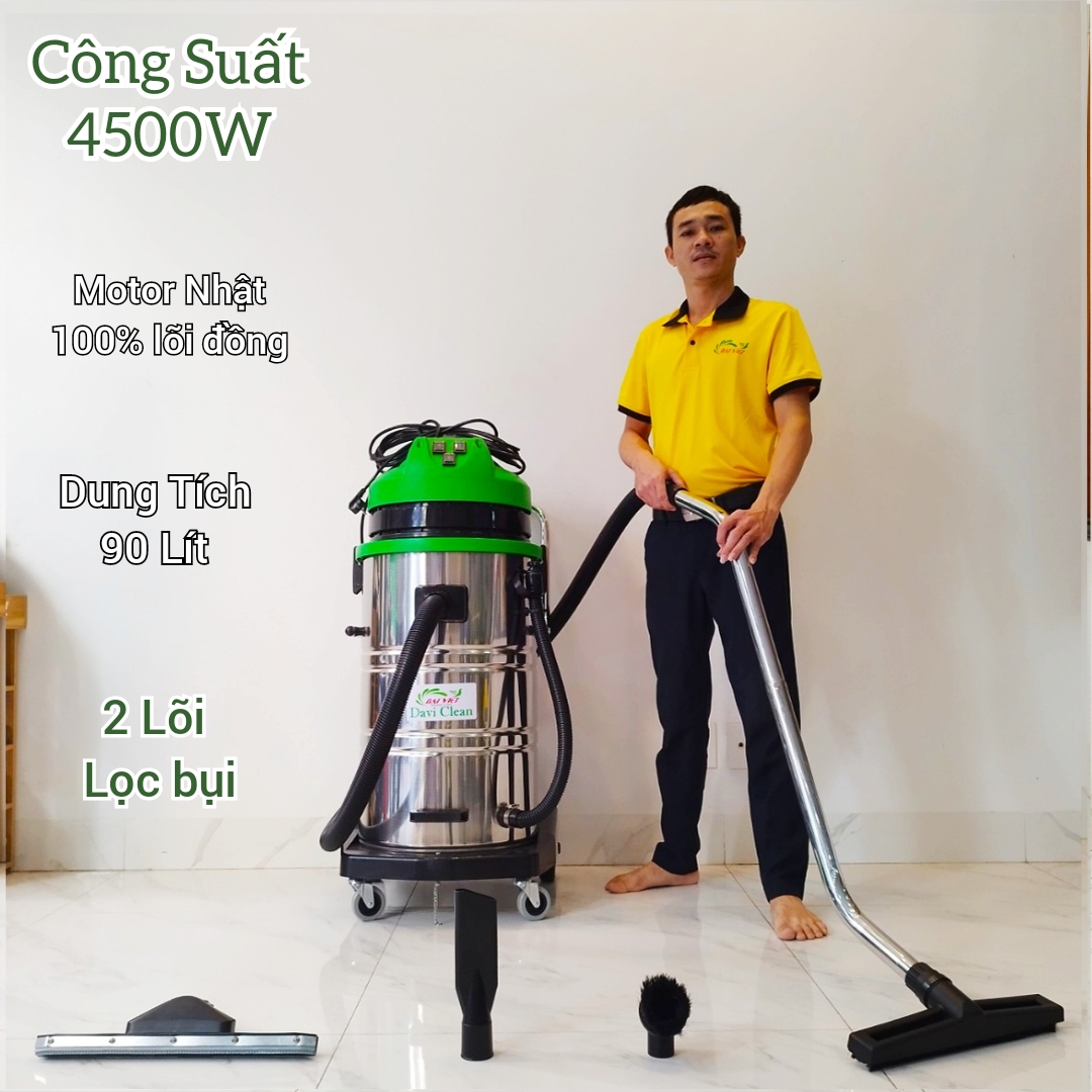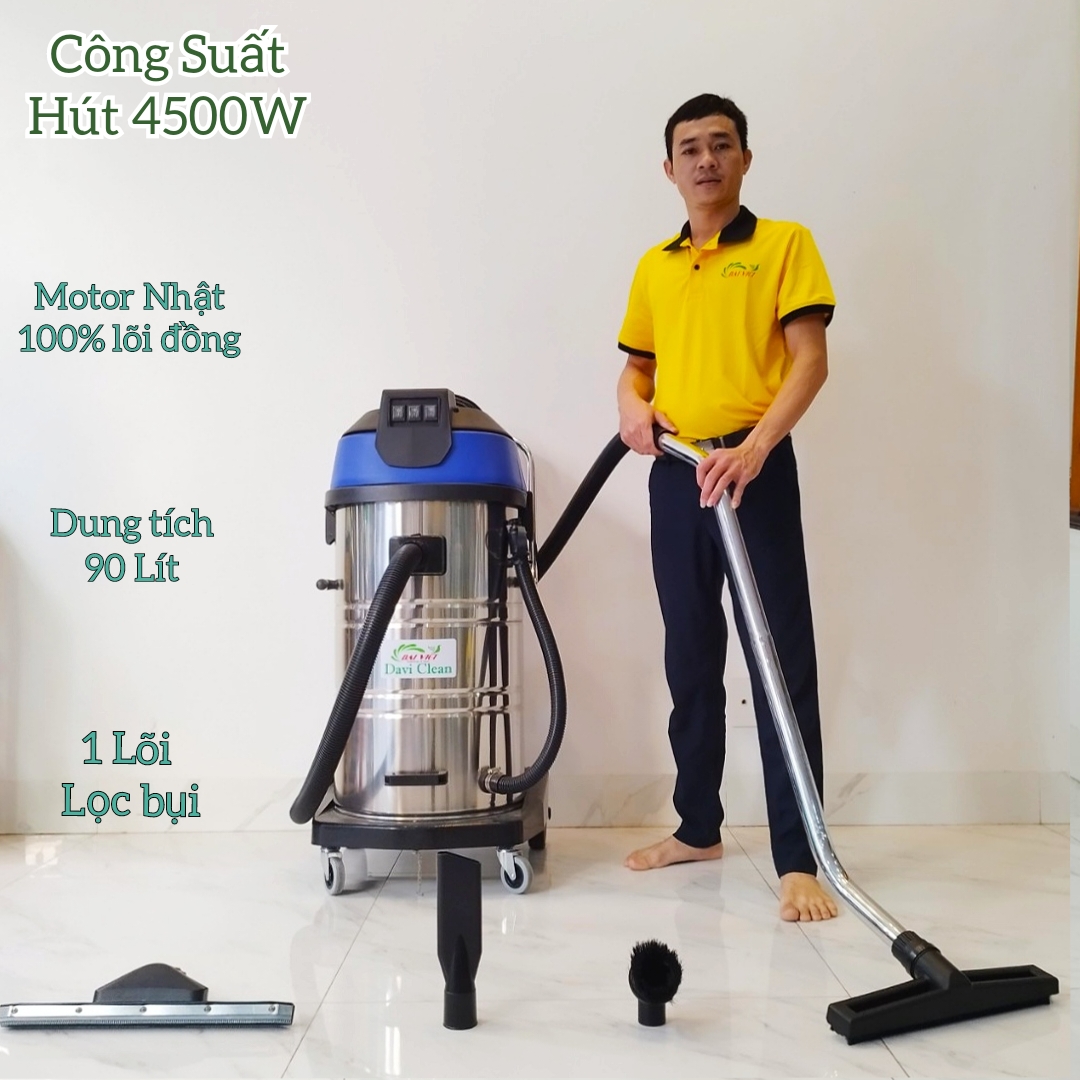 Daviclean DV3-90JP 2 lõi lọc có 3 motor với công suất mạnh mẽ 4500W, lực hút 25.000 Pa cùng lưu lượng khí 360 L/s, đáp ứng tốt nhu cầu vệ sinh diện tích lớn. Thùng chứa inox 304 dung tích 90L bền bỉ, đường kính 440mm, ống hút 40mm giúp thu gom bụi bẩn nhanh chóng. Thiết kế chắc chắn, dây điện dài 8m tiện lợi, bảo hành 18 tháng, phù hợp cho nhà xưởng, khách sạn, trung tâm thương mại.