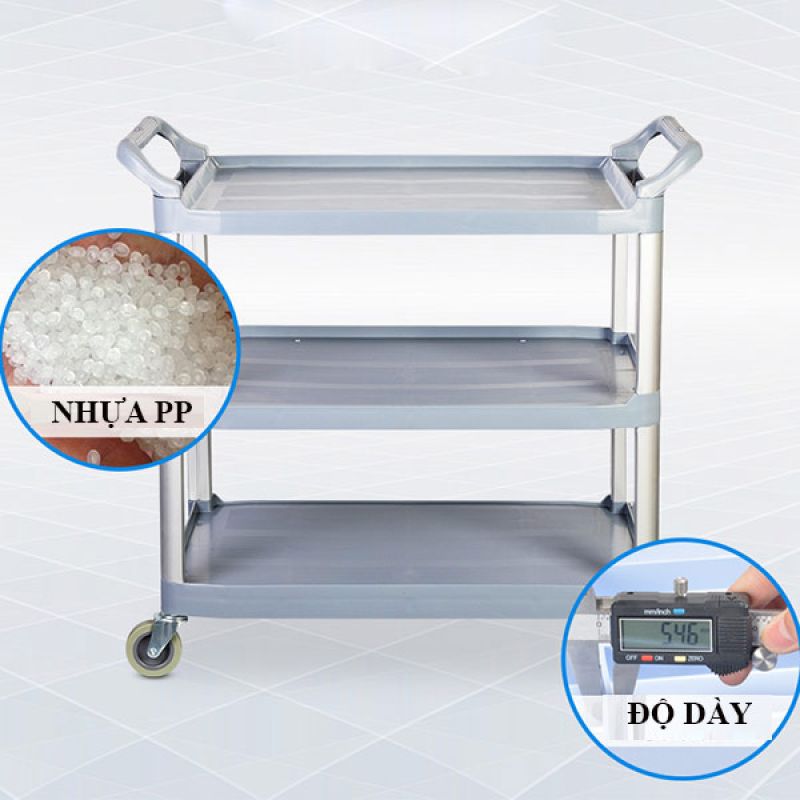Ba tầng chứa giúp sắp xếp vật dụng khoa học, dễ quản lý và lấy đồ nhanh chóng. Tay đẩy 2 chiều cho phép người dùng di chuyển và điều khiển xe từ cả hai phía, hỗ trợ thao tác linh hoạt ngay cả trong không gian chật hẹp.