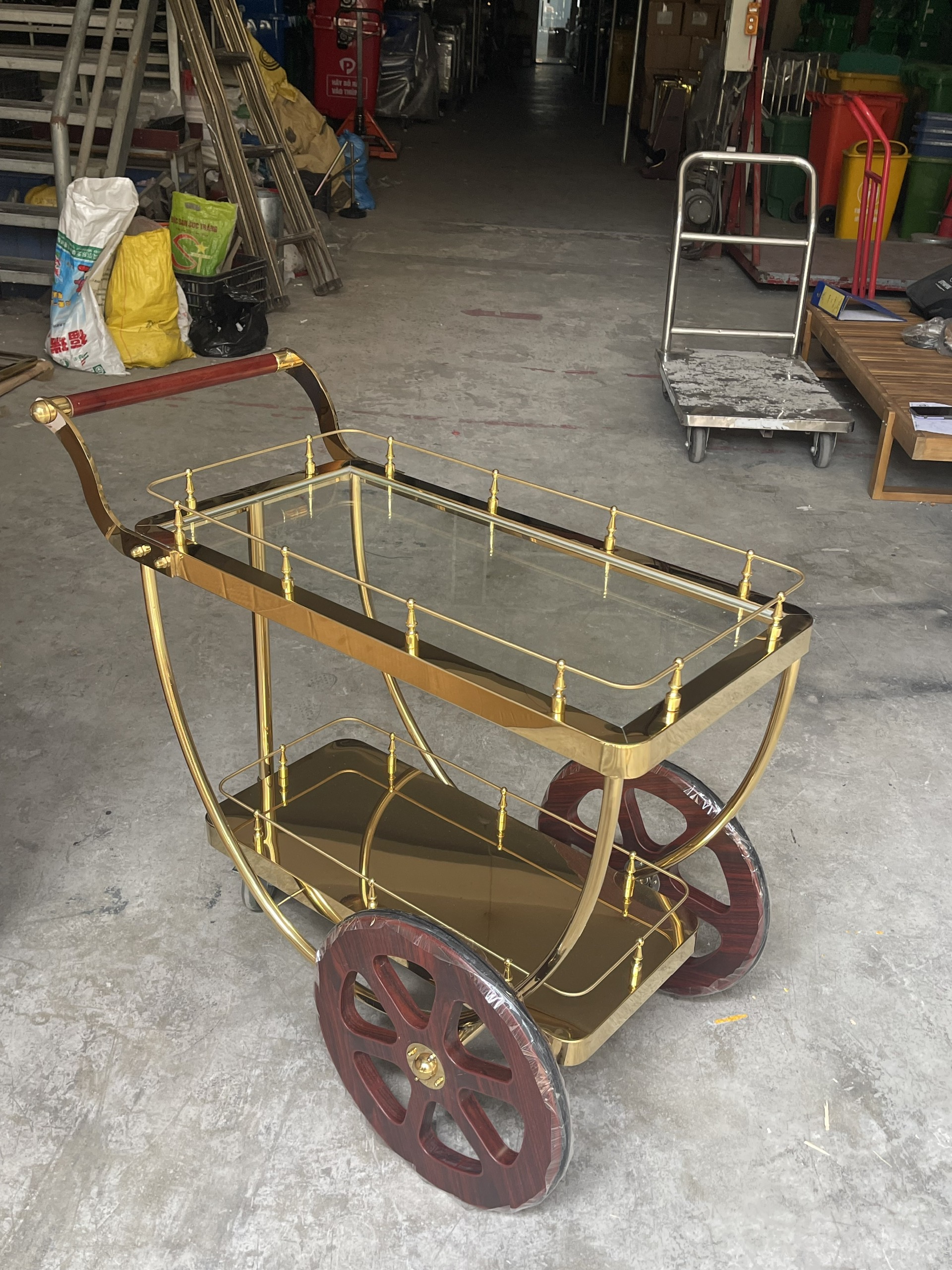 Với kích thước 90×43×90 cm, xe có cấu trúc hai tầng tiện dụng, đủ không gian để bày biện rượu, ly, khay hoặc vật dụng cần thiết. Kích thước tiêu chuẩn giúp xe dễ dàng di chuyển trong không gian nhà hàng, khách sạn hay khu vực tiệc, đồng thời vẫn đảm bảo tính cân đối và thẩm mỹ.