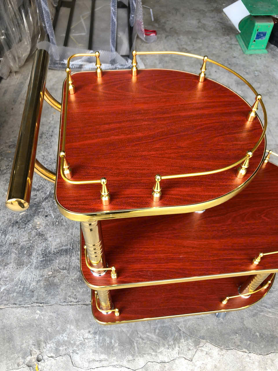 Khung xe được làm từ inox mạ vàng chống gỉ sét, bền bỉ với thời gian và dễ lau chùi. Bề mặt gỗ được xử lý kỹ lưỡng, chống ẩm, chống trầy xước, đảm bảo độ bóng mịn và tính thẩm mỹ lâu dài. Sự kết hợp hoàn hảo giữa hai chất liệu kim loại và gỗ mang đến sự chắc chắn, sang trọng và bền vững cho sản phẩm.