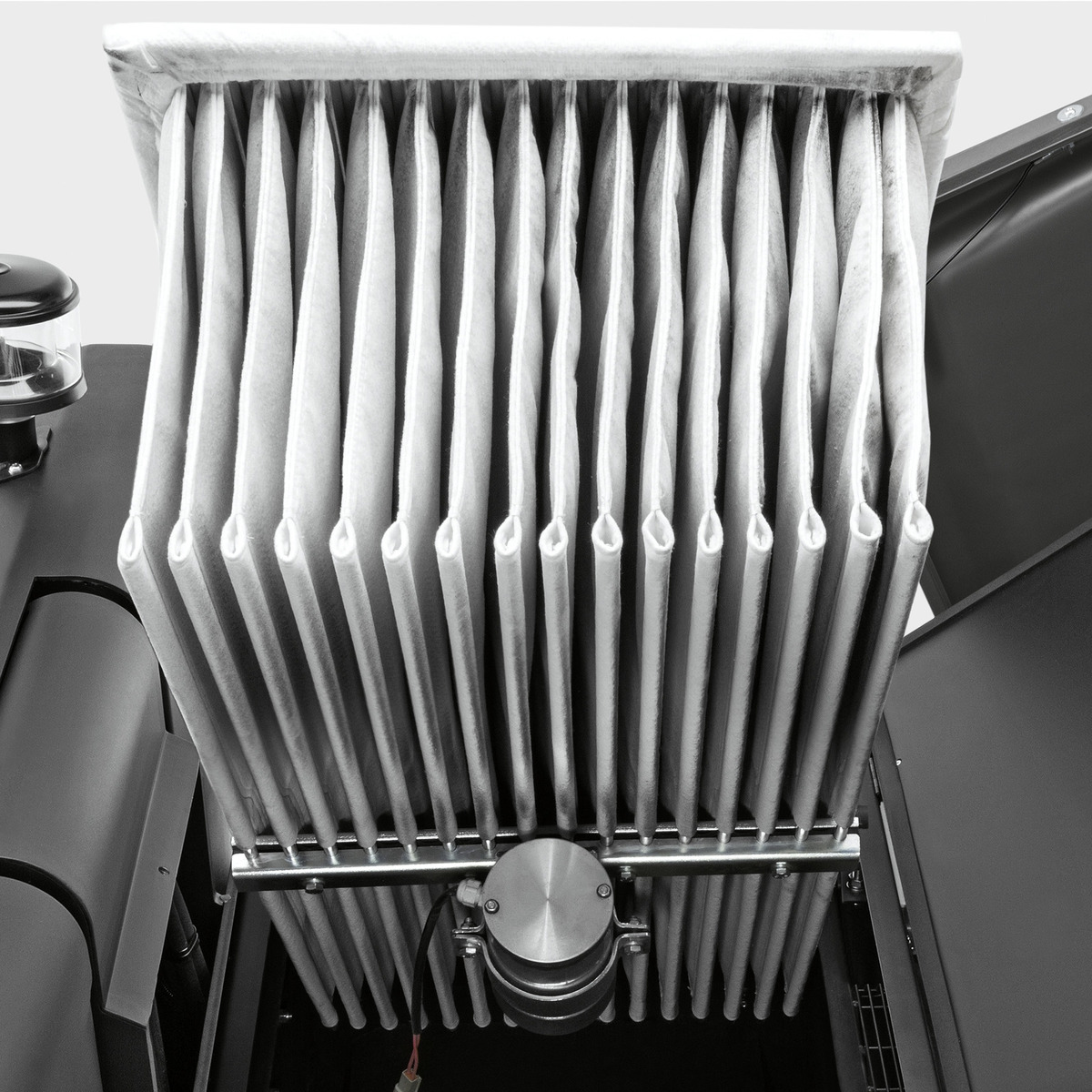 Karcher KM 130/300 R D Classic sử dụng màng lọc dạng túi với diện tích 7,8 m², đi kèm cơ chế rung giũ bụi tự động giúp giảm tối đa tình trạng tắc nghẽn và đảm bảo khả năng lọc ổn định trong thời gian dài.